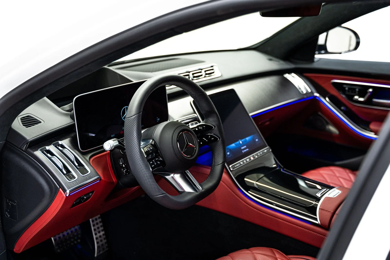 Interior & Technology: Offers hand-stitched leather seats, a 12.8-inch OLED touchscreen display, a 12.3-inch digital instrument cluster, a Burmester® 3D surround sound system, and ambient lighting for a first-class driving experience.