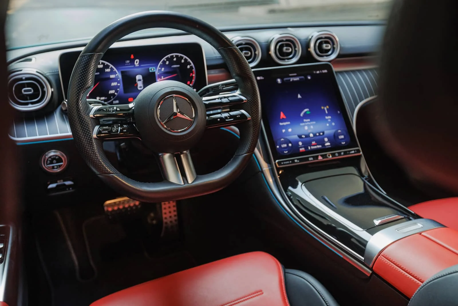Exterior: Finished in Tiffany, the C200 showcases a sleek sedan profile with a wide grille, slim LED headlights, and smooth body lines. It rides on 17- to 19-inch alloy wheels, with chrome touches highlighting its refined character.