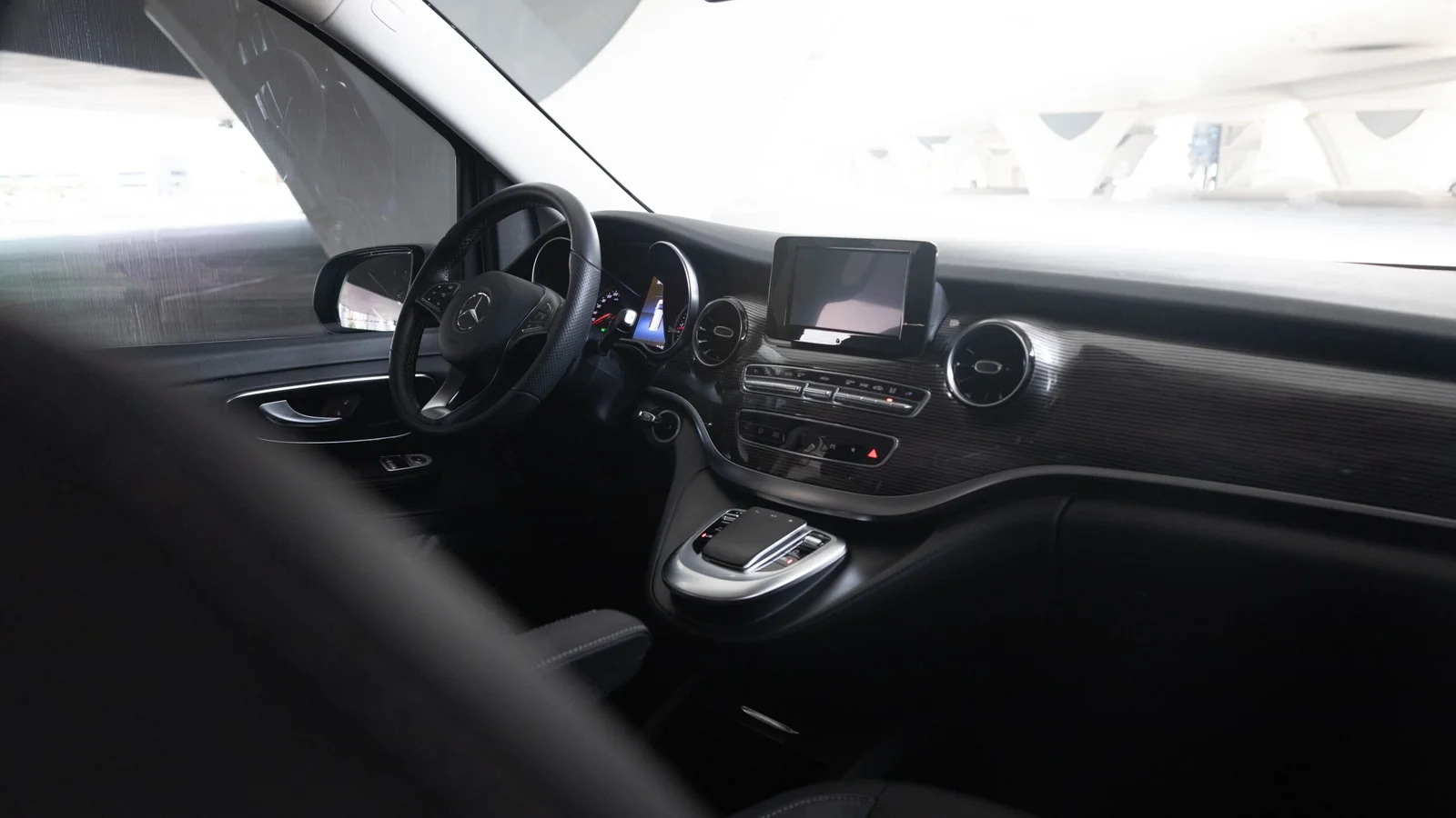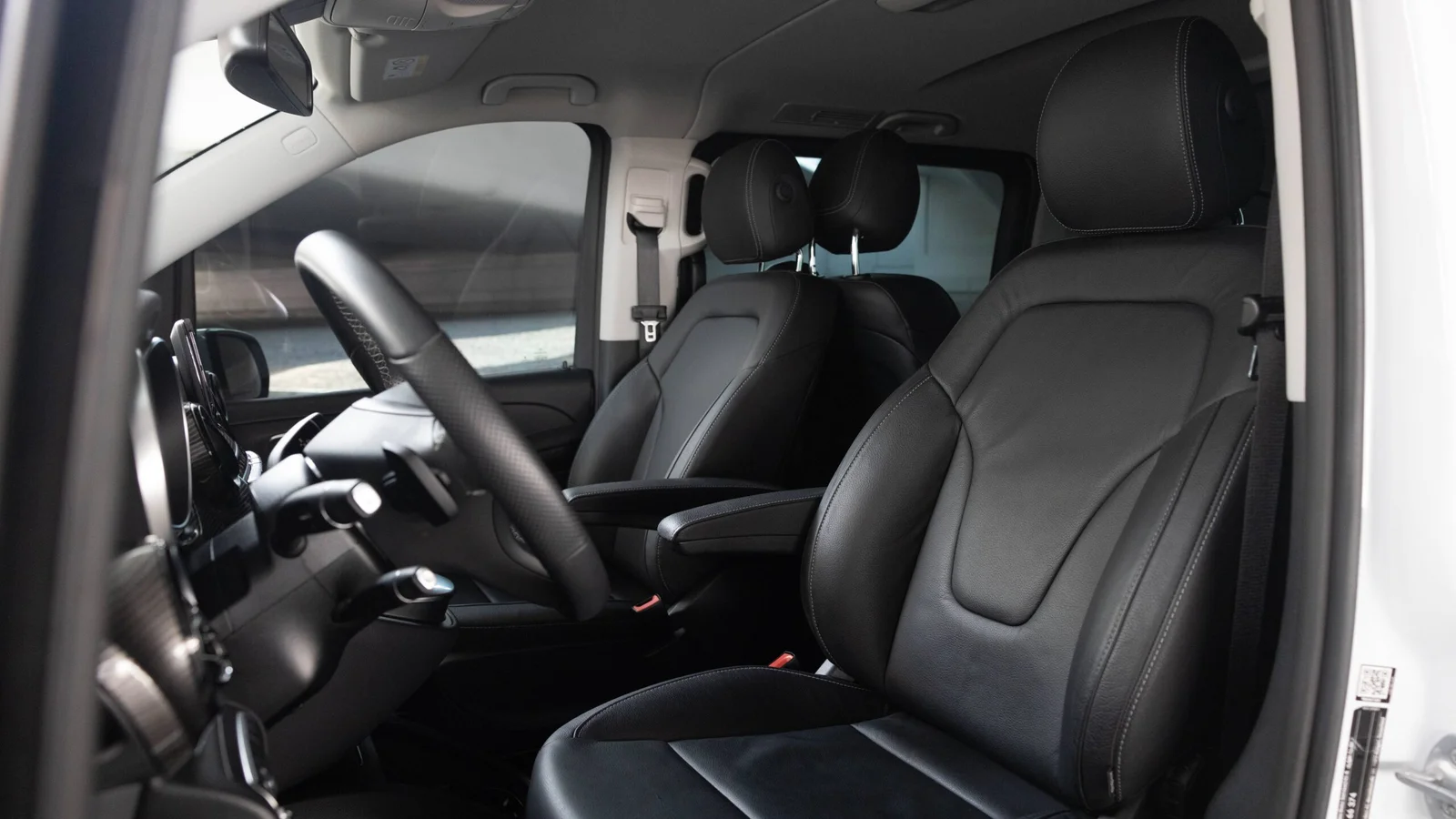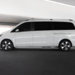Exterior: Finished in White, the V-Class features a refined MPV design with a wide front grille, LED headlights, and dual sliding doors for easy access. It rides on 17- to 19-inch alloy wheels, with chrome accents adding to its executive appearance.