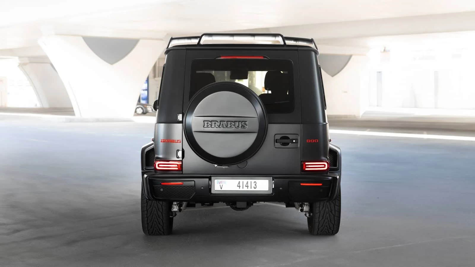 Exterior: Finished in Black Matte, the Brabus G63 features a wide-body carbon-fiber kit, revised bumpers, and a roof-mounted light bar. It rides on 23-inch forged alloy wheels with high-grip tires. Quad exhaust outlets and Brabus badging complete its distinct look.
